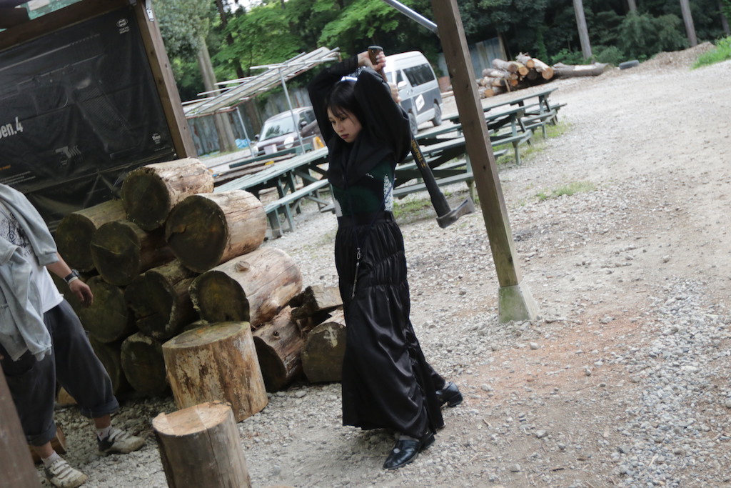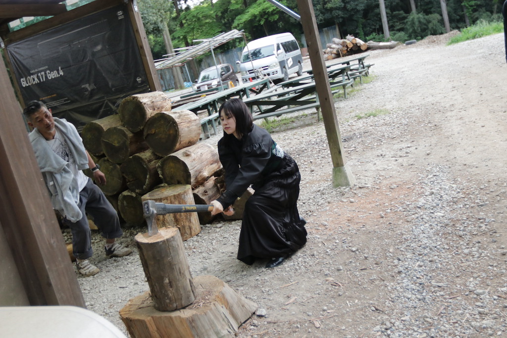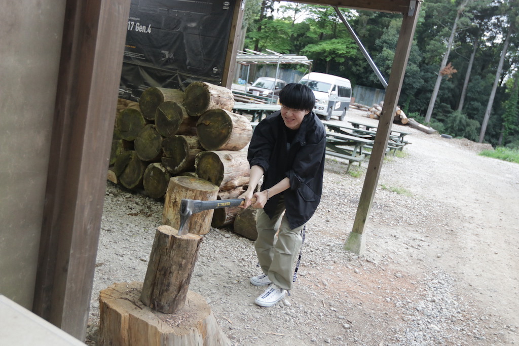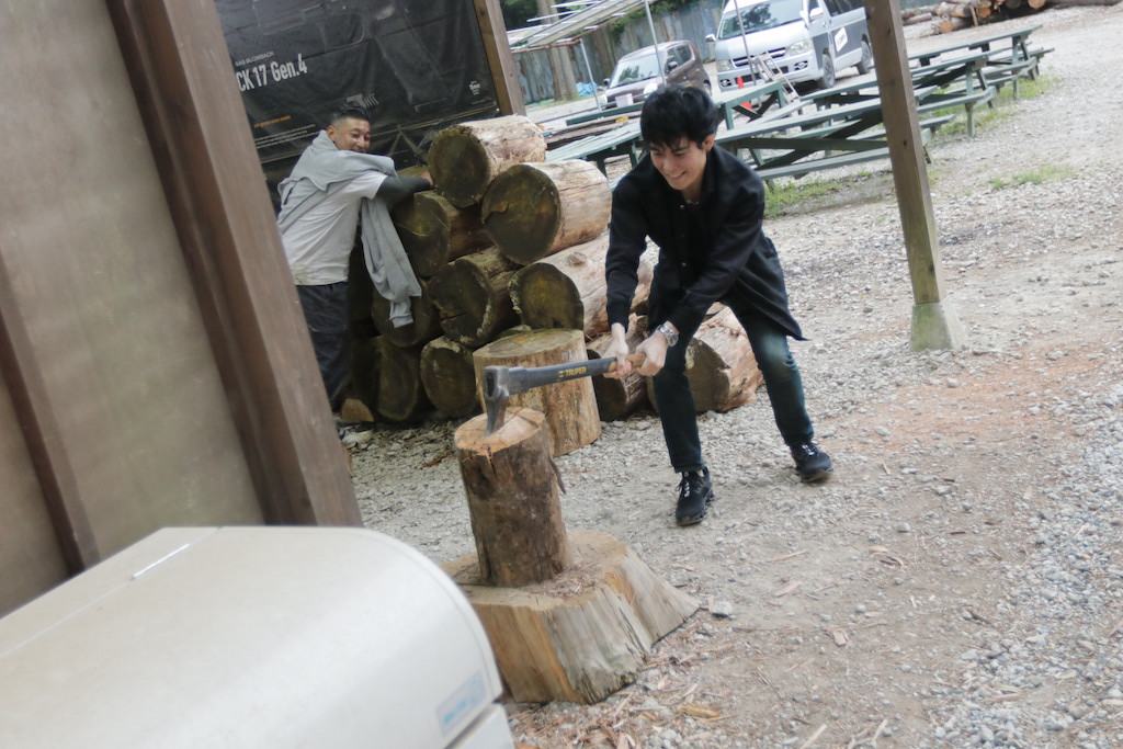 って事で、薪割りからスタート💦 そんな格好で😅