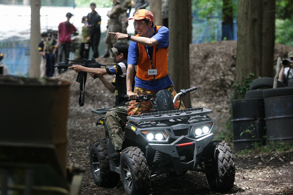 スタッフの運転するバギーの後部座席で、電動ガンを使って的を撃て!的を倒した数で景品がもらえちゃいます♪