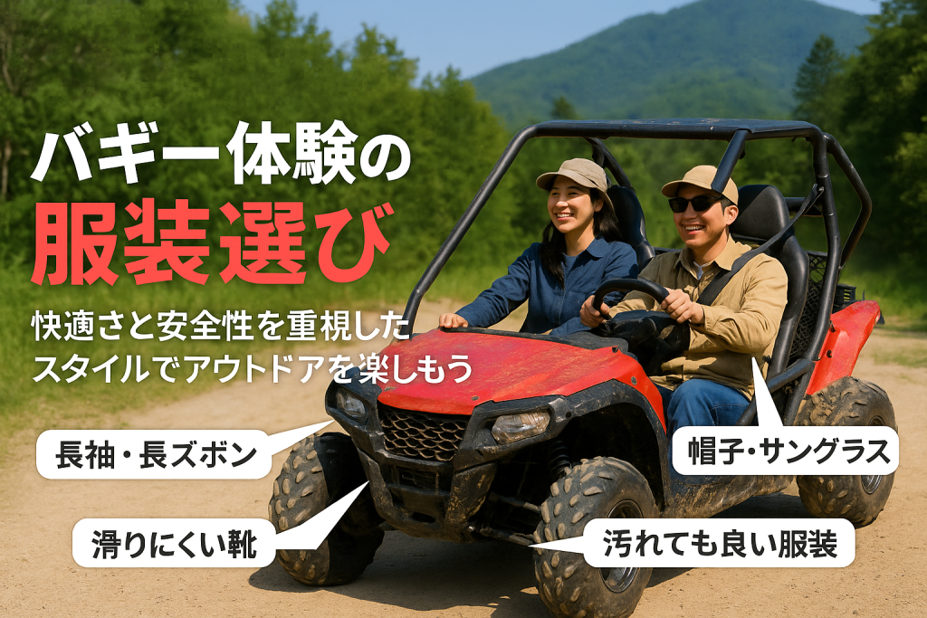 バギー体験に参加する際、どんな服装を選べば良いのか迷っていませんか。バギーは特にアウトドアでのアクティビティなので、体験中の服装選びは非常に重要です。動きやすさや安全性、さらに快適さを考慮しないと、せっかくの楽しい時間が不快になったり、... -